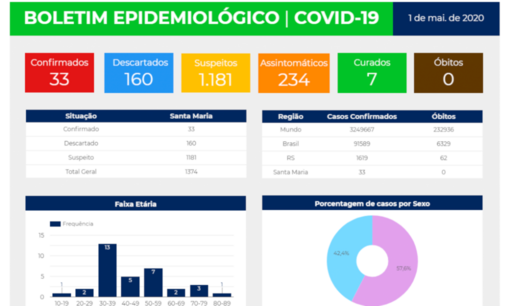 Santa Maria não teve nenhum caso confirmado de coronavírus nesta sexta-feira. Com isso, a cidade segue com 33 confirmações. Já foram descartadas 160 suspeitas, sete pacientes estão curados e outras 1.181 pessoas são consideradas suspeitas para a Covid-19. Foram 19 casos suspeitos registrados a mais em comparação com esta quinta-feira